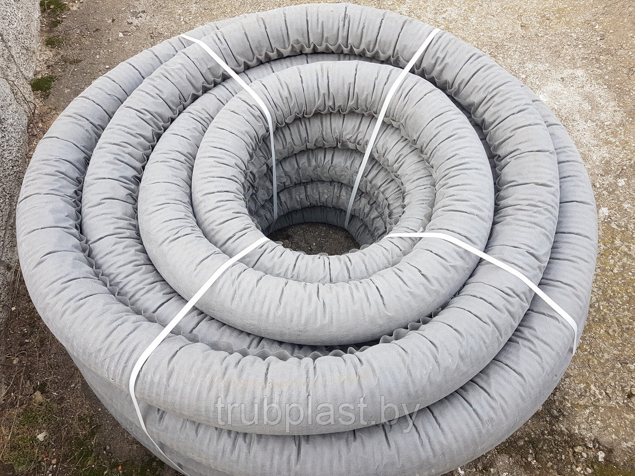- Труба дренажная с геотекстильным фильтром диаметром 110 мм SN 4 в бухтах по 50 м.